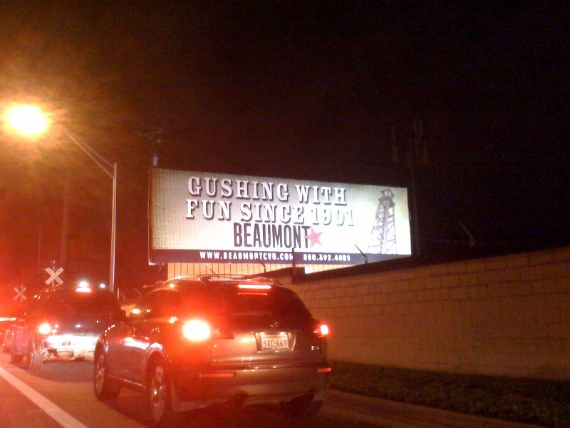 Kim and I have been seeing variations of this billboard all over town, promoting tourism for Beaumont. I've never really considered Beaumont for tourism - it's famous around Texas for smelling like rotten eggs, due to all that gushing oil.