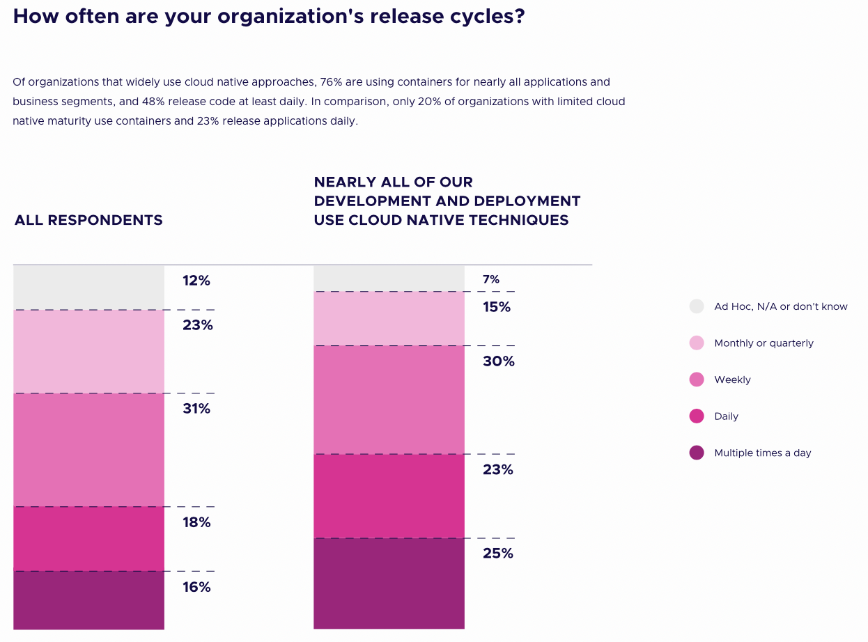 The more you use kubernetes, the closer to deploying at will (multiple times a day) you get: “organizations that widely use cloud native approaches, 76% are using containers for nearly all applications and business segments, and 48% release code at least daily. In comparison, only 20% of organizations with limited cloud native maturity use containers and 23% release applications daily.” // there’s a 9% rise in multiple times a day releases if you’re in the “nearly all” category.
