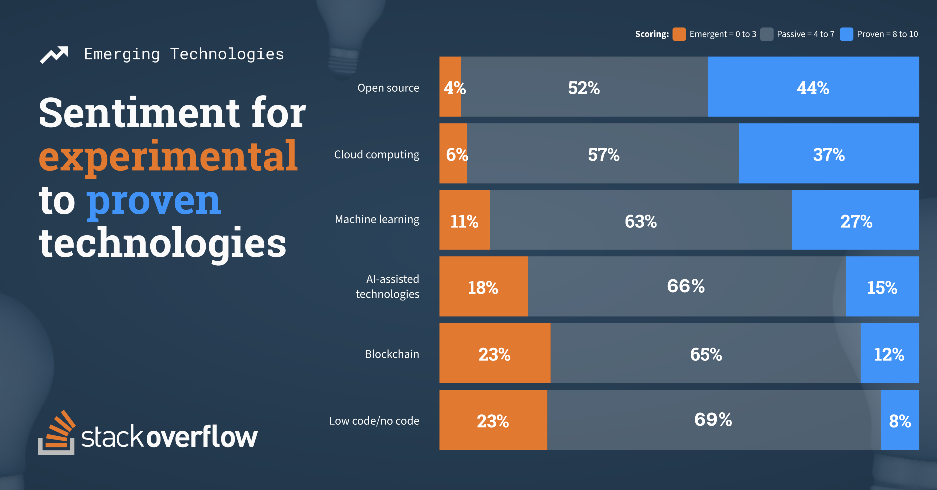 What’s more interesting is (1) 3–5 year growth/decline rates (that’s the most valuable part, for example, of the years of the RedMonk Programming Language Rankings), and, (2) thinking about how few people choose the top choice (or bottom). For example, in this survey (chart above), 44% of people think open source is “proven,” with 52% being “passive,” and 4% saying it’s emergent. 4% is a valuable number because you can say, “look, everyone agrees that open source is good, at least we know they don’t think it’s shit.” Also, the chart above is an example of the opposite case to the narcism of small differences: there’s a dramatic difference between the top two items and the bottom three. The difference in “proven” between open source (44%) and the bottom choice, “low code” (8%), is very meaningful: developers do not like low code.